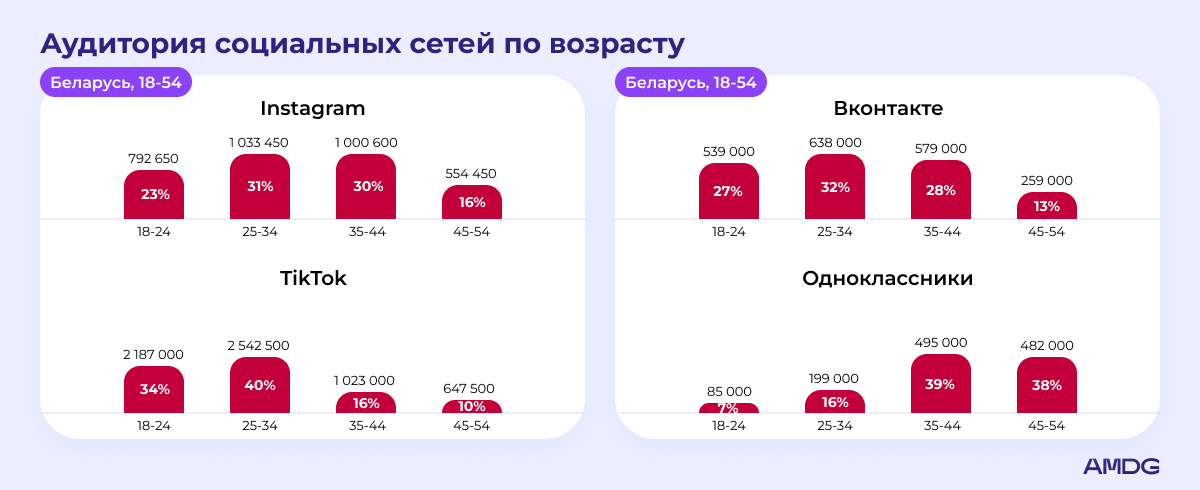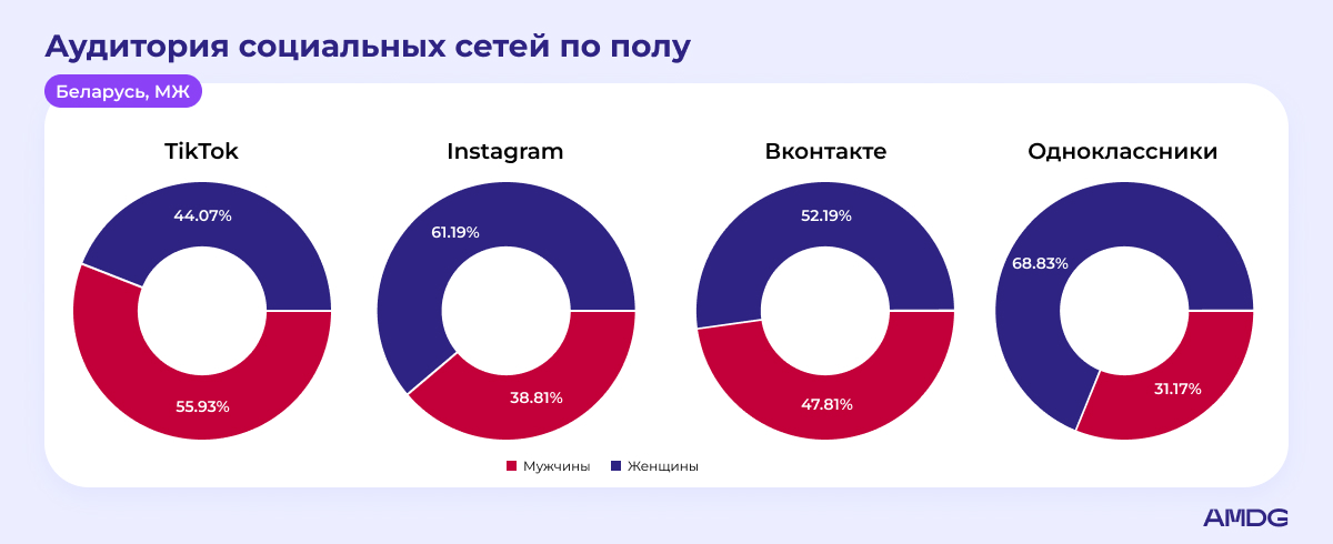 В Instagram, Одноклассниках и ВКонтакте >60% пользователей — женщины. В TikTok ситуация немного другая — более 55% пользователей площадки в Беларуси — мужчины.