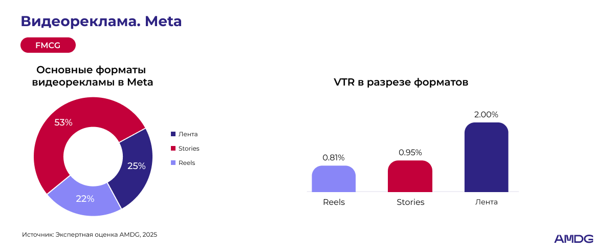 Основная доля показов рекламодателей приходится на формат Stories (53%). Вертикальные форматы, такие как Reels и Stories, используются для расширения охвата, при этом формат ленты эффективен для вовлечения аудитории (VTR — 2,00%).