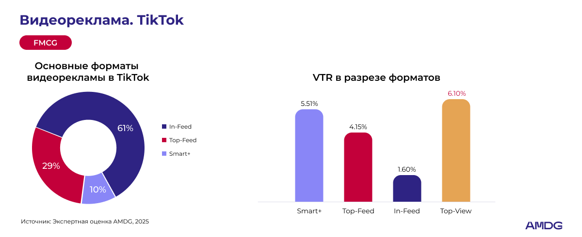 Самый досматриваемый формат в TikTok — TopView (VTR — 6,1%). Стоит отметить также высокий VTR у нового для площадки формата Smart+ (5,51%).
