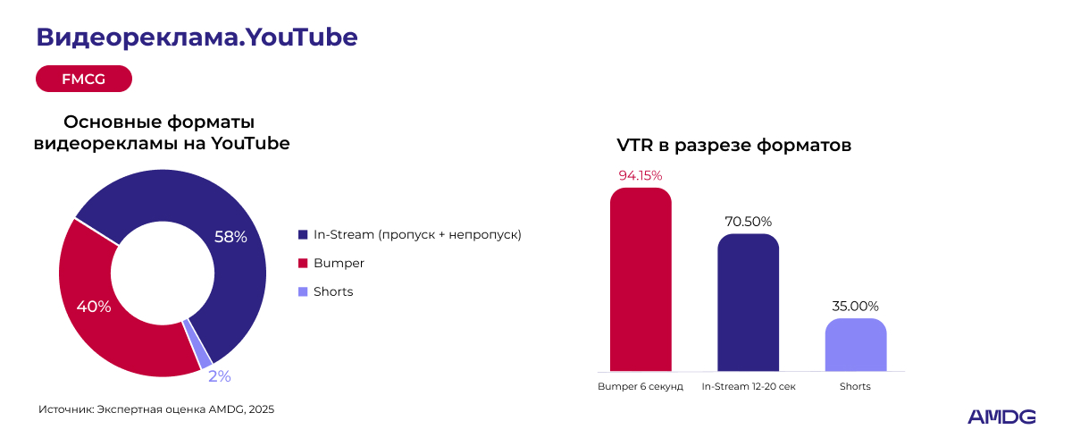 Максимальная доля показов в YouTube (58%) приходится на формат In-Stream. При этом самый высокий VTR (94,15%) у формата Bumper.