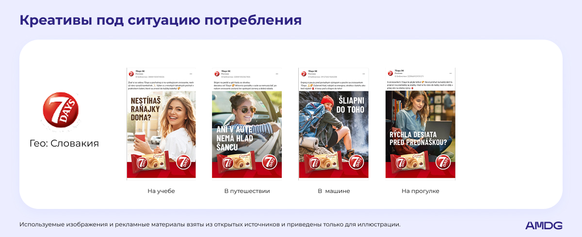 Креативы под занятие показывают ситуации потребления для продукта. Для каждой ситуации разрабатывается отдельный визуал и рекламный слоган.