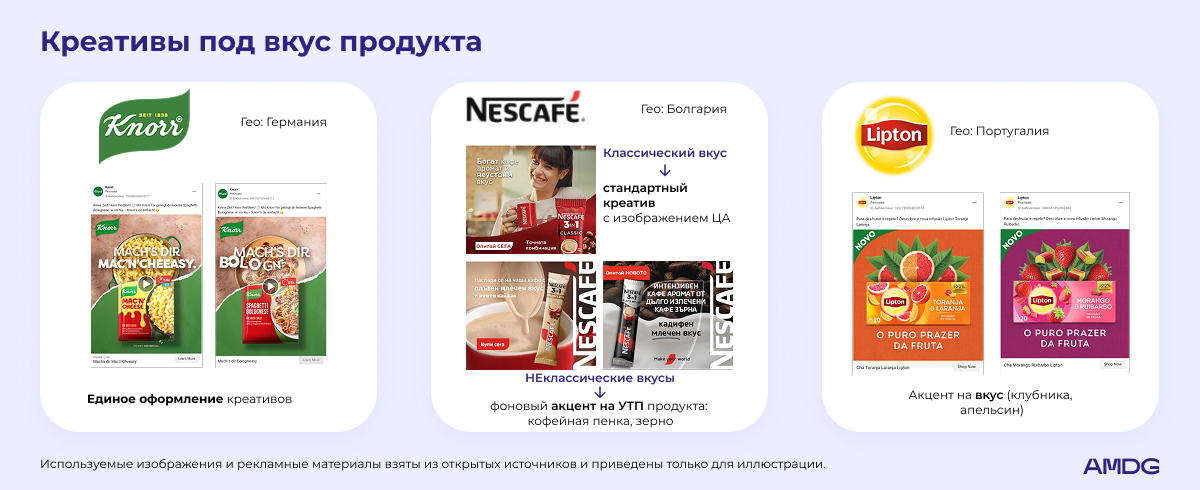 В середине 2025 года на мировом рынке FMCG прослеживаются следующие тренды в креативах: креативы под вкус, под занятие, с рецептами, креативы под сегменты.