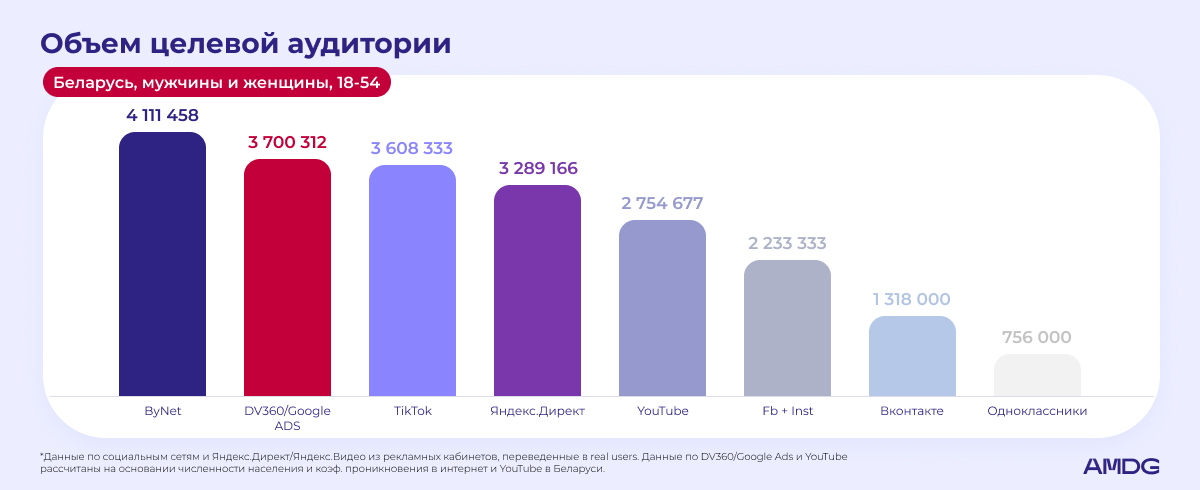Общий объем аудитории Байнета — 4,1 млн пользователей. Максимальный объем пользователей наблюдаем в системах DV360/Google Ads — 3,7 млн пользователей. На 2-м месте по охвату — TikTok (3,6 млн пользователей), а за ним – Яндекс.Директ, где объем целевой аудитории достигает 3,2 млн пользователей.