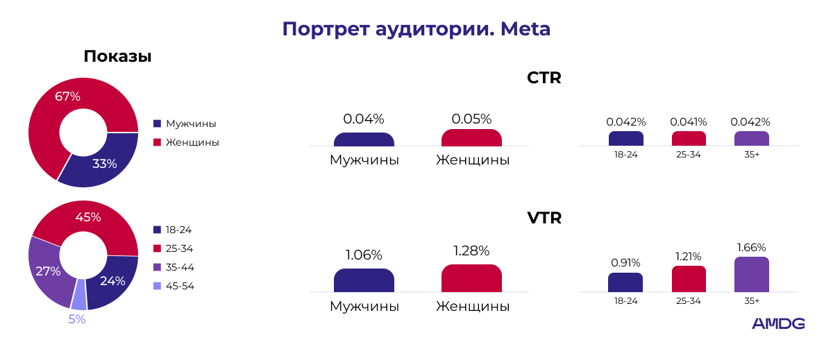 Наибольшая доля показов в Meta приходится на женскую аудиторию (67%). Женщины на 21% чаще досматривают видео до конца, CTR у обоих полов примерно одинаковый.