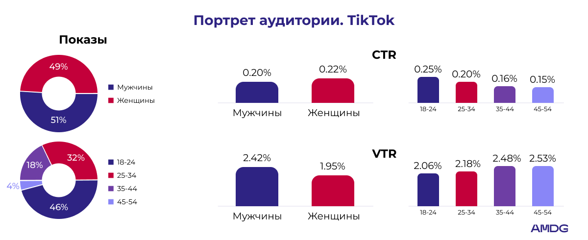 78% показов в TikTok приходится на молодую аудиторию до 34 лет.