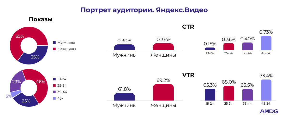 В Яндекс.Видео женская аудитория лидирует по доле показов (65%).
