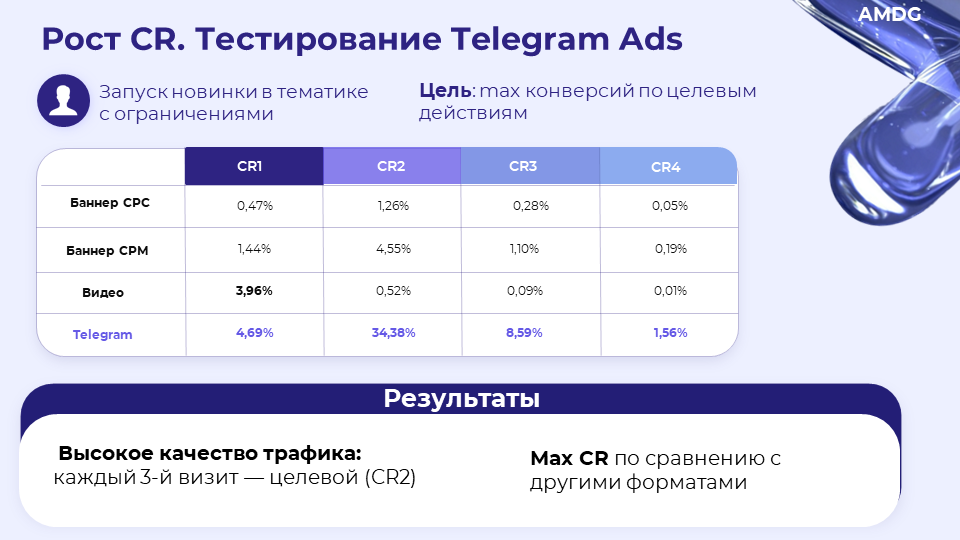 В дополнение к другим рекламным каналам был протестирован инструмент Telegram Ads, который позволил привлечь аудиторию через нативное размещение в каналах и расширить охват кампании.