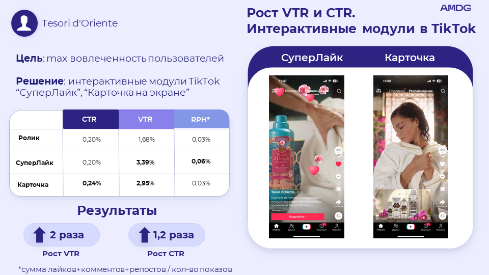 Были использованы интерактивные форматы TikTok: “СуперЛайк” и “Карточка на экране”. Они дополняли видеоролик и стимулировали пользователей к дополнительным действиям внутри рекламы.
