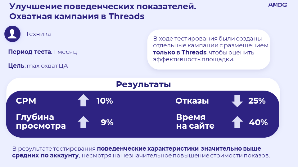 Были запущены отдельные кампании с размещением только в Threads. Это позволило оценить влияние площадки на поведенческие характеристики пользователей.