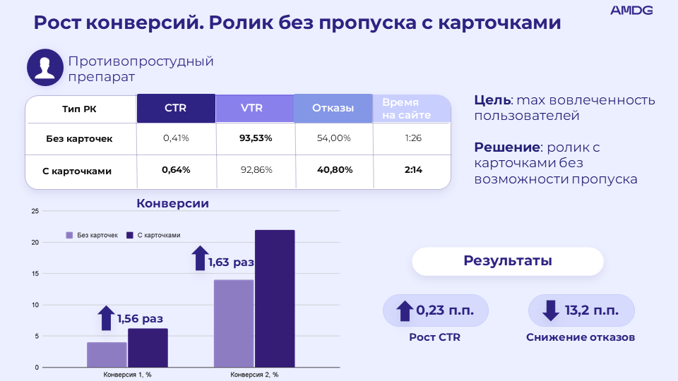 Показатель отказов снизился с 54% до 40,8%, кликабельность ролика выросла на 0,23 п.п., а показатель конверсии — в 1,63 раза.