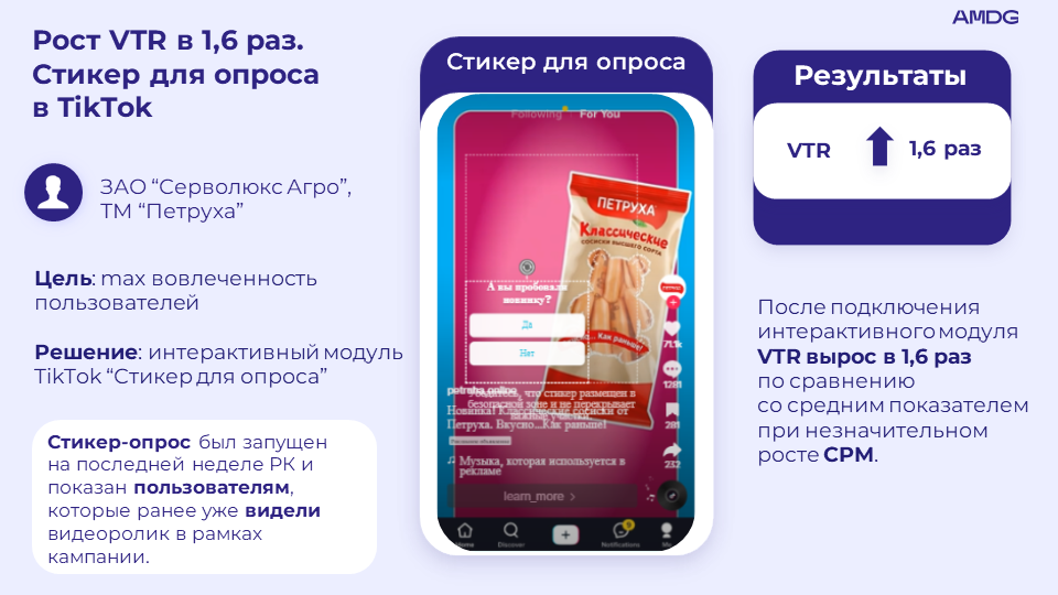 На последней неделе рекламной кампании был добавлен интерактивный элемент — стикер-опрос TikTok. Он был показан только тем пользователям, которые ранее уже видели ролик.