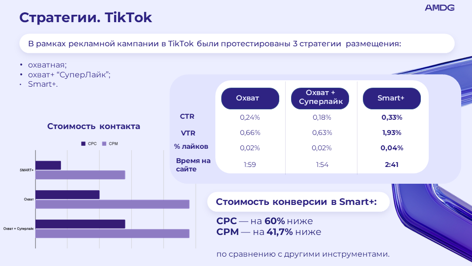 В рамках рекламной кампании стояла задача определить стратегию размещения в TikTok, которая позволит повысить эффективность кампании и снизить стоимость рекламных контактов.