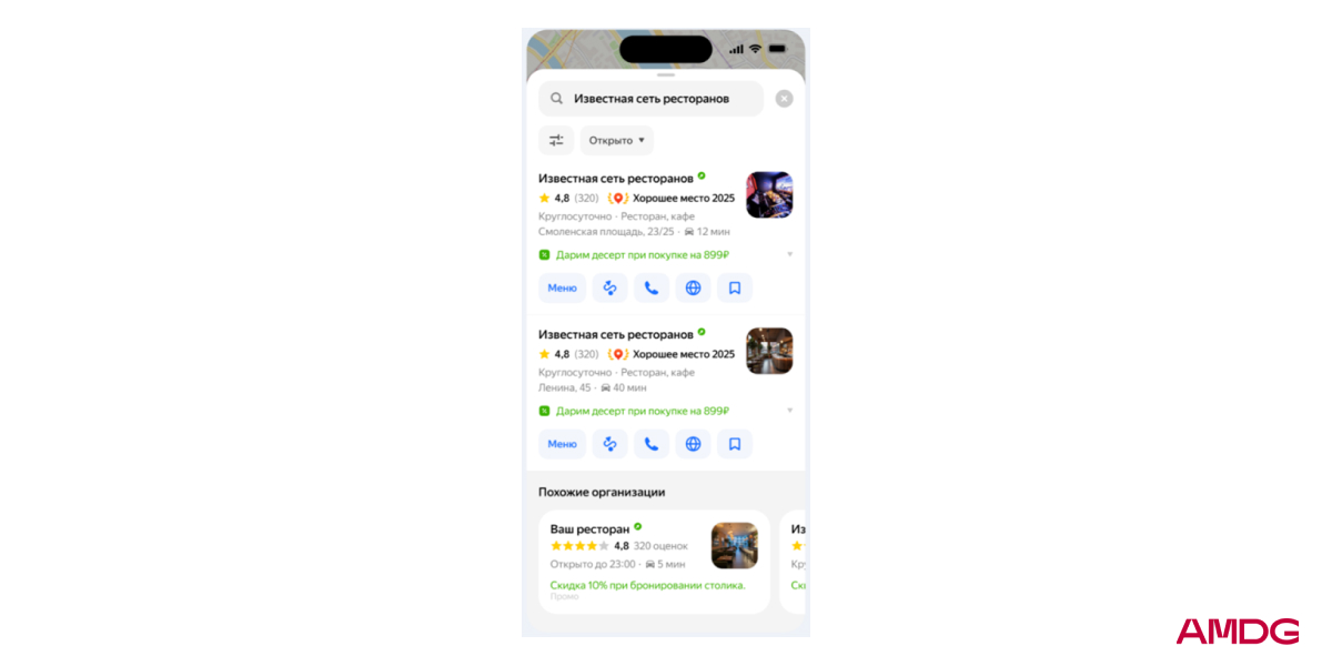 5. В Яндекс Картах появилась опция продвижения по брендовым запросам в карусели “Похожие организации”. Теперь при поиске конкретной компании по названию рядом с ее карточкой могут показываться конкуренты из той же категории и района. Формат настраивается через Яндекс Директ, а участники подбираются автоматически по аукциону без ручного выбора брендов.