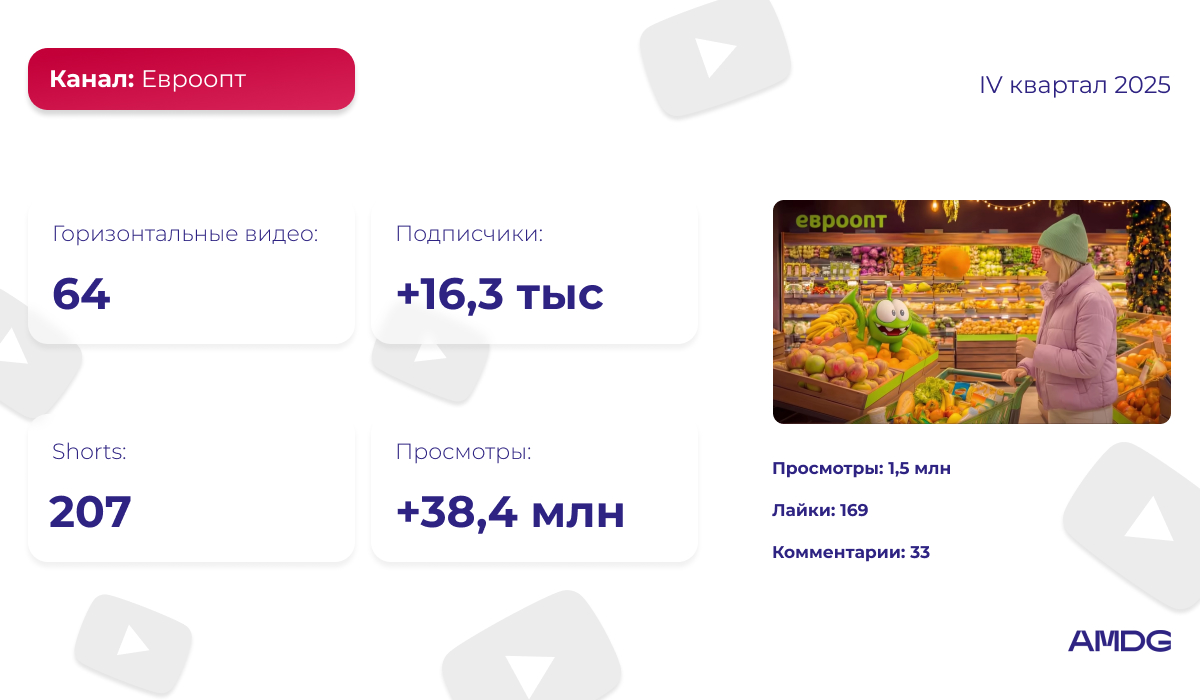 Канал “Евроопт” регулярно пополняется контентом. На странице публикуются актуальные акции, результаты розыгрышей, рецепты и подкасты с экспертами из различных отраслей. За IV квартал 2025 года компания разместила 64 горизонтальных видео и 207 Shorts. Такая активность помогла привлечь более 16,3 тысячи подписчиков и увеличить число просмотров на 38,4 миллиона.