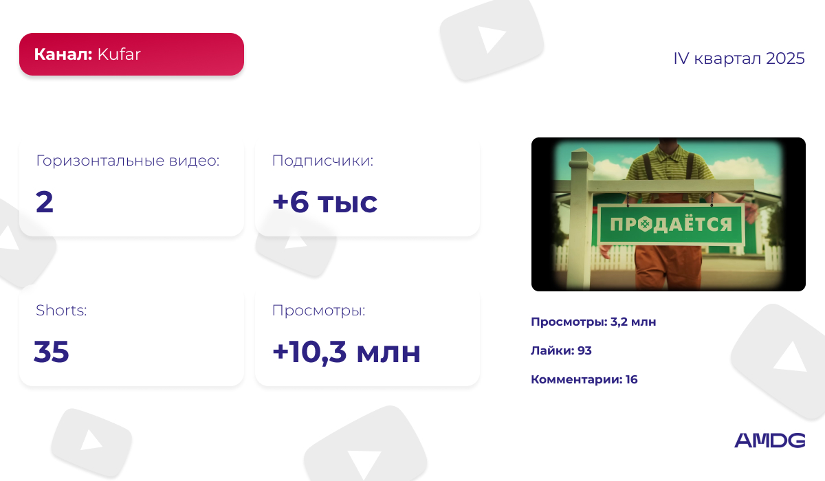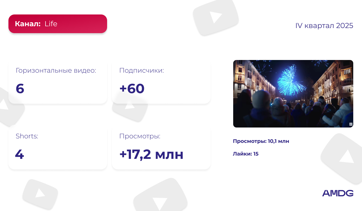 За IV квартал 2025 года компания опубликовала 6 горизонтальных видео и 4 Shorts. Несмотря на небольшое количество публикаций, канал получил почти 17,2 миллиона просмотров.