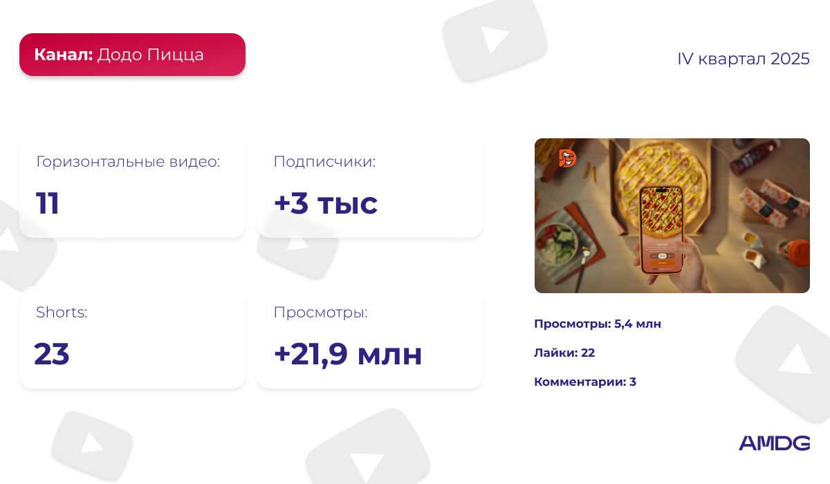 За квартал на странице появилось 11 горизонтальных и 23 вертикальных видео. Самым просматриваемым на канале стал ролик об акции “вторая пицца в подарок” — он набрал более 5,4 миллиона просмотров, 22 лайка и 3 комментария. Небольшое количество реакций при большом числе просмотров может говорить о том, что ролик использовался в рекламном продвижении.