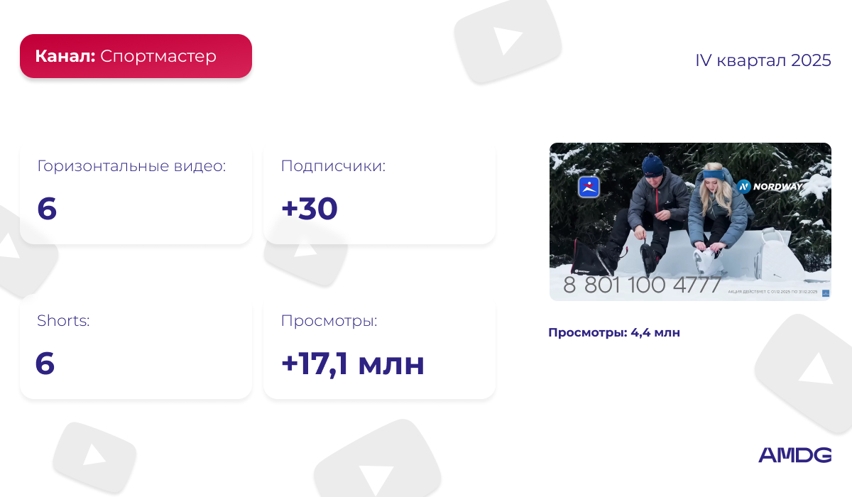 За IV квартал 2025 года канал “Спортмастер” увеличил число просмотров на 17,1 миллиона, а прирост аудитории составил 30 подписчиков. За анализируемый период на странице было опубликовано 6 горизонтальных видео и 6 Shorts.