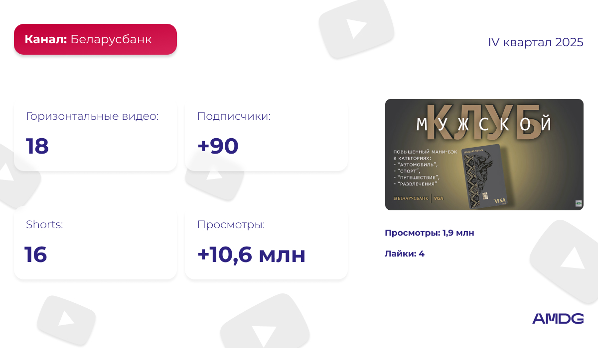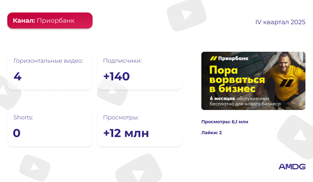 В своем продвижении Приорбанк делает упор на горизонтальные ролики — за последние 3 месяца на странице появилось 4 видео в таком формате. За IV квартал 2025 года число просмотров на канале бренда выросло на 12 миллионов.