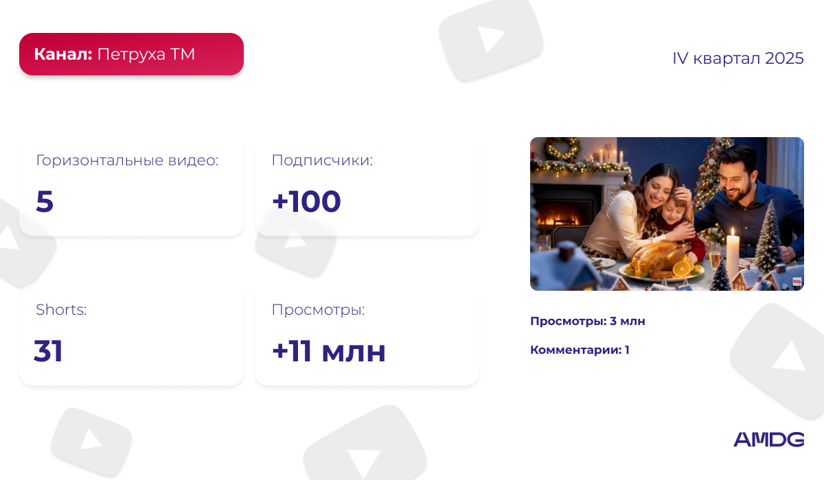 В IV квартале 2025 года аудитория канала “Петруха” увеличилась на 100 подписчиков, а суммарный прирост просмотров превысил 11 миллионов. За этот период было размещено 5 роликов в горизонтальном формате и 31 Shorts. В контенте страницы преобладают необычные рецепты, которые каждый сможет повторить на своей кухне.