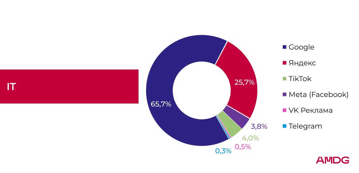 В 2025 году в рекламе сферы IT выделился явный лидер — Google (65,7%). Его доля выросла почти в 1,5 раза. В 2024 году Google делил расходы практически поровну с Яндексом. Теперь доля Яндекса составила только 25,7%. В TikTok было инвестировано 4% рекламного бюджета, в Meta (Facebook) — 3,8%. Часть бюджета по-прежнему отдается VK Рекламе и Telegram — менее 1%.