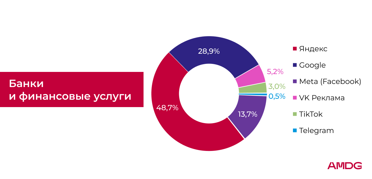 В 2025 году Яндекс продолжил лидировать среди рекламных площадок для банков и финансовых услуг, однако его доля снизилась с 51% до 48,7%. На втором месте — Google (28,9%). Его доля за год выросла на 6,7 процентного пункта и приблизилась к показателю 2023 года. Meta (Facebook) осталась на прежнем уровне — 13,7%. Следующей по популярности стала VK Реклама (5,2%), затем — TikTok (3%). В 2025 году рекламодатели категории “Банки и финансовые услуги” впервые тестировали для продвижения Telegram. Его доля составила менее 1%.
